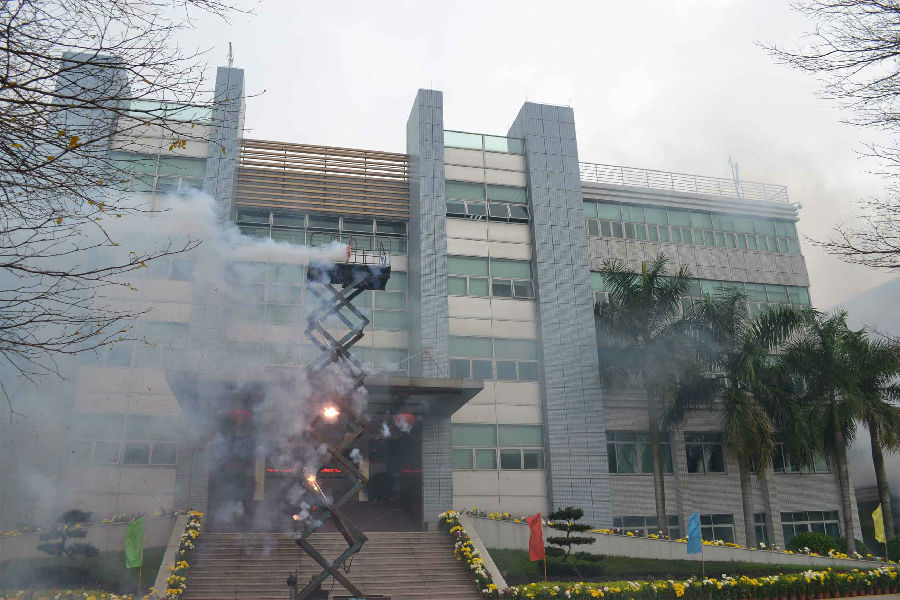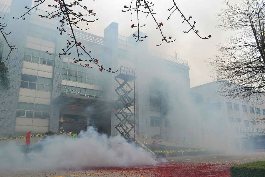 2月26日一大早,順威股份集團(tuán)辦公大樓門(mén)口偌大的廣場(chǎng)花團(tuán)錦簇,長(zhǎng)長(zhǎng)的鞭炮早已架好。這時(shí),不少的順威員工已井然有序地圍在鞭炮周?chē)4蠹蚁嗷ニ统鲂履甑拿篮米8?,熱心等待著祥瑞時(shí)刻的到來(lái)。