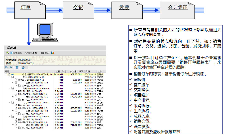 在SAP中只需要有銷(xiāo)售訂單,就能查詢(xún)與這個(gè)銷(xiāo)售訂單關(guān)聯(lián)的大部分重要業(yè)務(wù)憑證數(shù)據(jù),做到了數(shù)據(jù)的簡(jiǎn)便快捷查詢(xún)和業(yè)務(wù)數(shù)據(jù)的一體化。